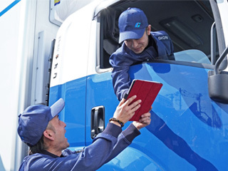 出社後にお店ごとに台車に仕分けられた荷物を積み込み、配送先に出発。基本的に1日2回の運行で、約100キロ前後の走行距離です。1回の配送で2~3件、決まった店舗への配送ですので、比較的仕事を早く覚えられますよ!!